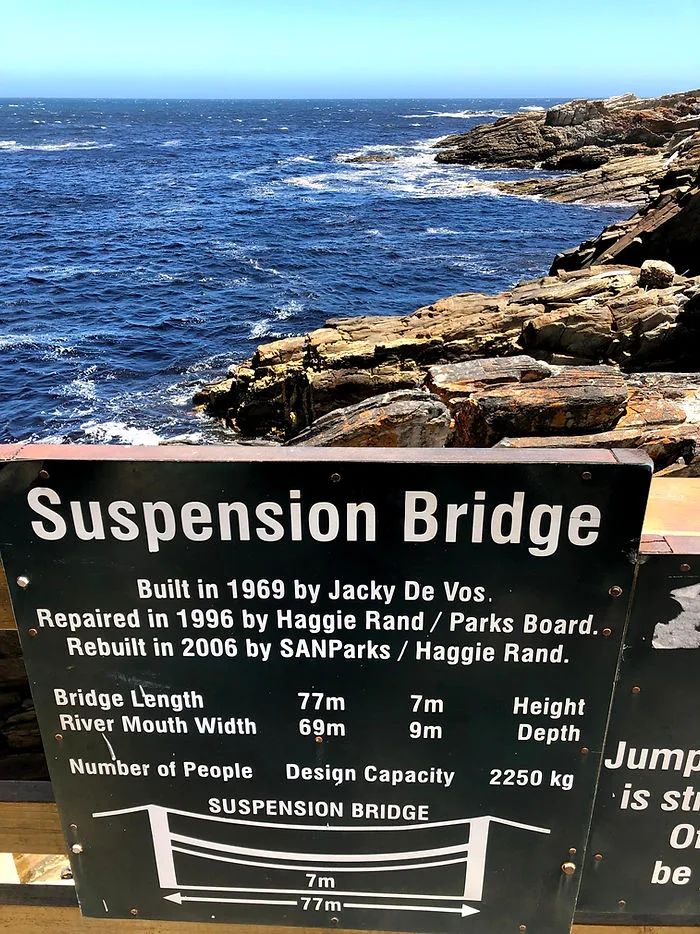 Passando a ponte, a poucos quilômetros está o Tsitsikamma National Park, um parque enorme, com muitas trilhas e onde está a a ponte suspensa em cima do Storms River, que é o Rio que encontra com o Oceano Índico. Fizemos uma pequena trilha para chegar nesse local, que rendeu muitas fotos.