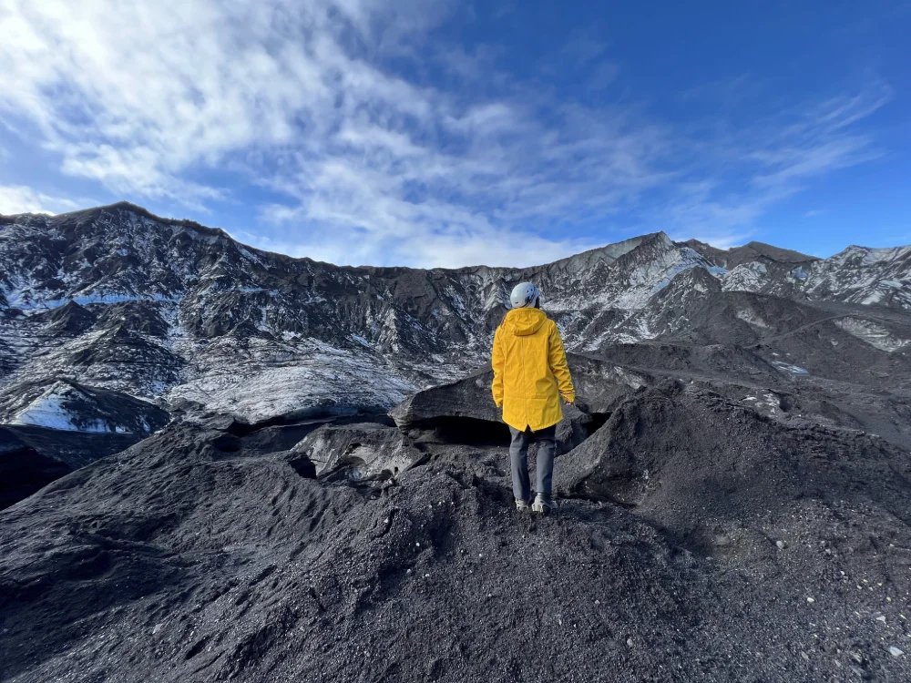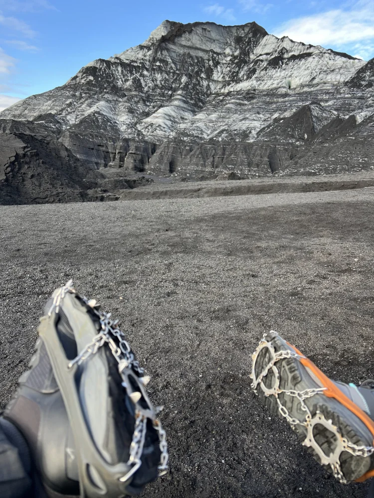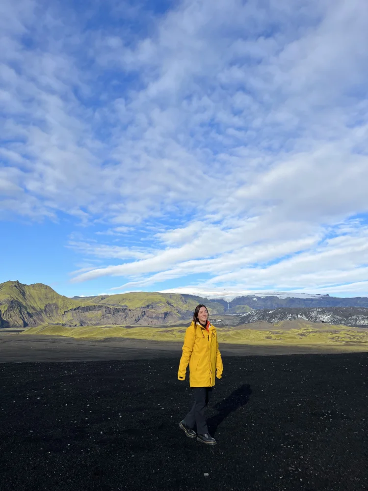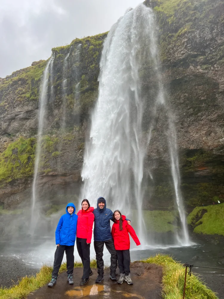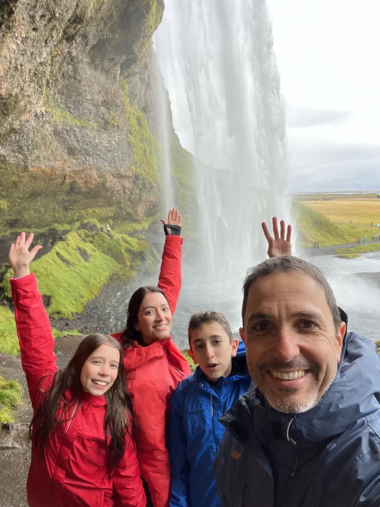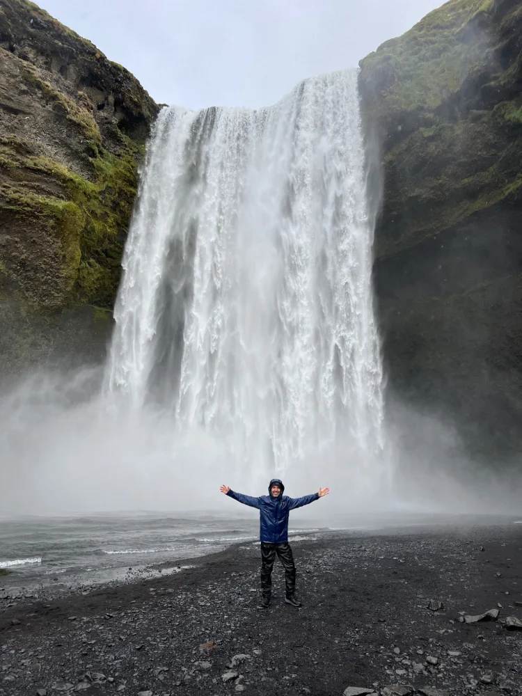 A estrada que liga Reykjavík a Vík é uma das mais bonitas do país, pontuada por cachoeiras, campos de lava e vistas abertas para as geleiras que dominam o horizonte.Nossa primeira parada foi na Seljalandsfoss, uma das cachoeiras mais fotografadas da Islândia. O diferencial é que é possível caminhar por trás da queda d’água, o que permite observar o cenário sob outra perspectiva — e sentir na pele a força da natureza islandesa.