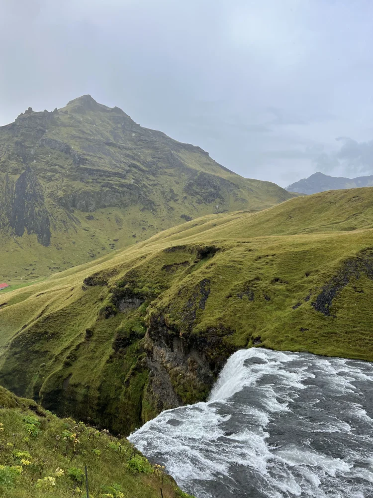 Logo adiante está a Skógafoss, uma parede d’água monumental com 60 metros de altura, cercada por um verde intenso. O sol, quando aparece, cria arcos-íris constantes nas gotículas de água, e há uma escadaria ao lado que leva até o topo, de onde se tem uma vista espetacular da planície.