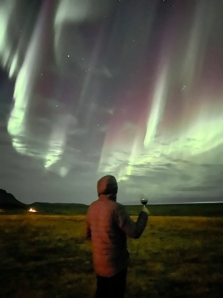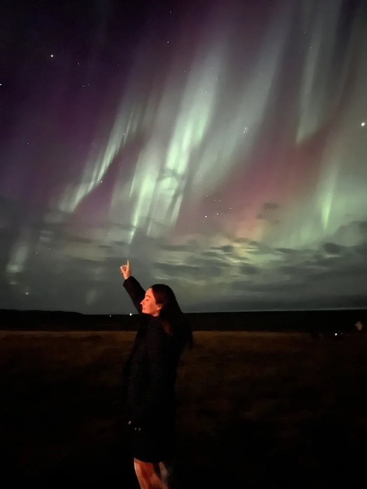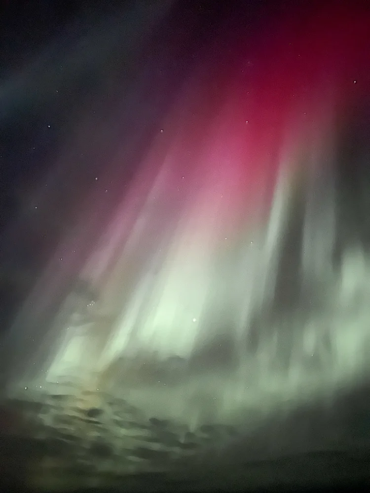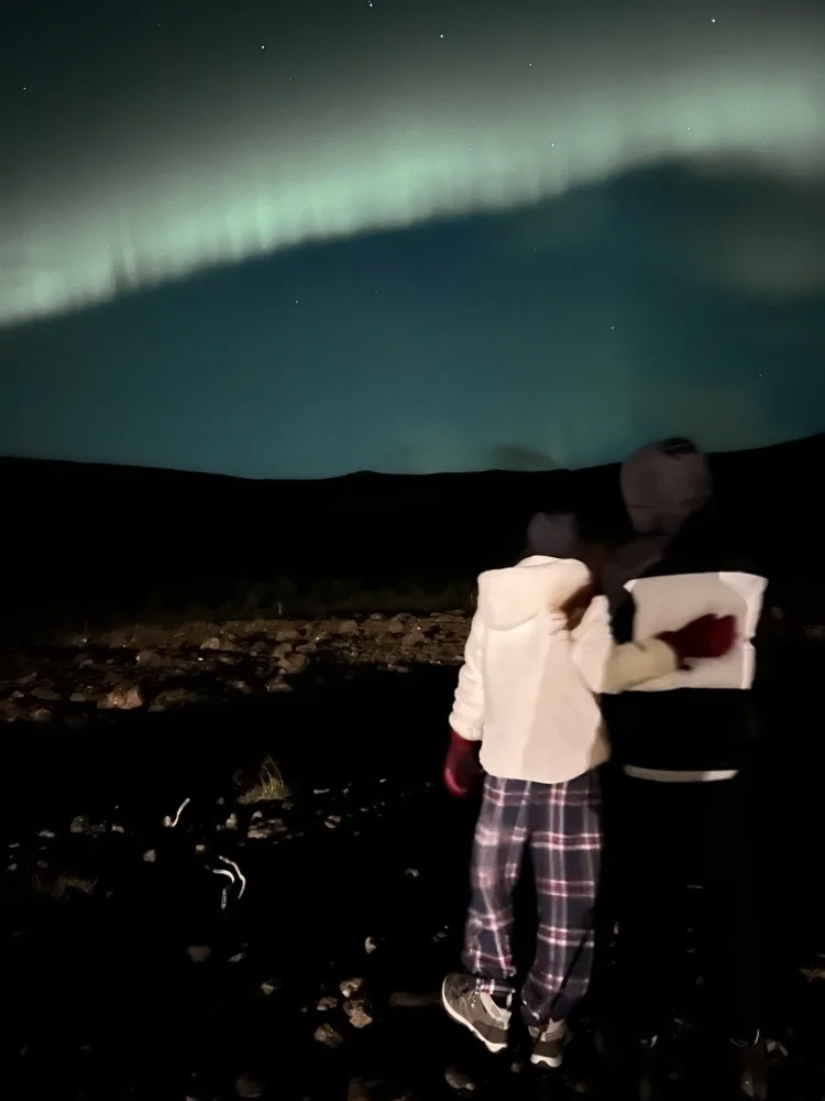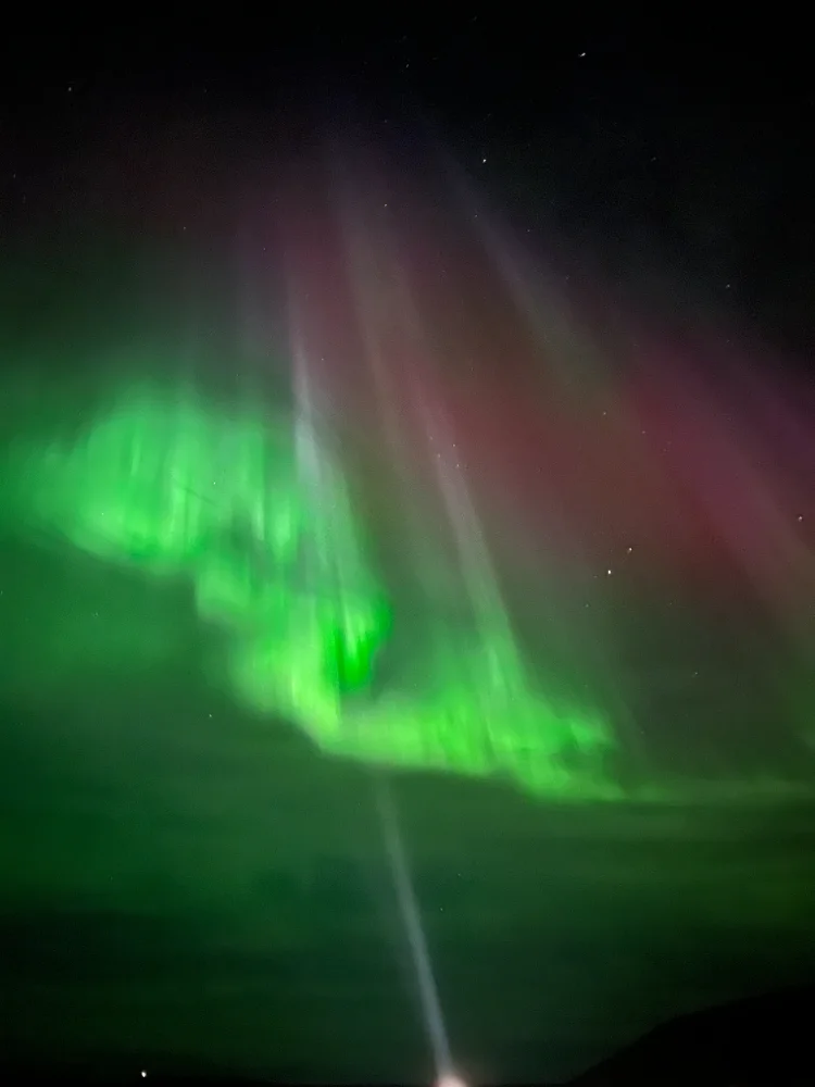 Para quem nunca viu, a aurora boreal é um fenômeno natural que acontece quando partículas solares entram em contato com a atmosfera da Terra, produzindo luzes coloridas que dançam no céu. O índice que mede sua intensidade é o KP, que vai de 0 a 9 — quanto maior o número, mais forte o espetáculo.Naquela noite, o céu estava completamente limpo, e por volta das 22h começaram a surgir as primeiras luzes. Aos poucos, elas se transformaram em ondas de cor verde intensa, misturadas a tons de rosa e vermelho. O índice era KP 6, e as luzes dançaram por horas sobre nossas cabeças. Ficamos ali, em silêncio, observando — foi, sem dúvida, a noite mais bonita e emocionante de toda a viagem.