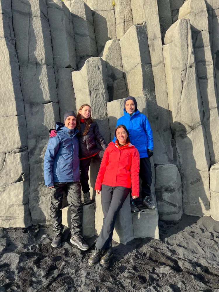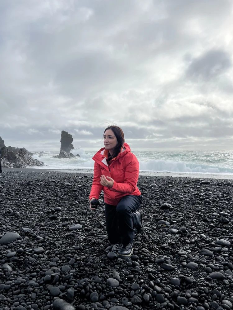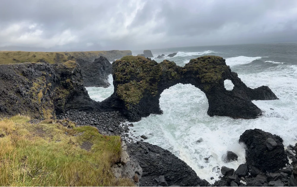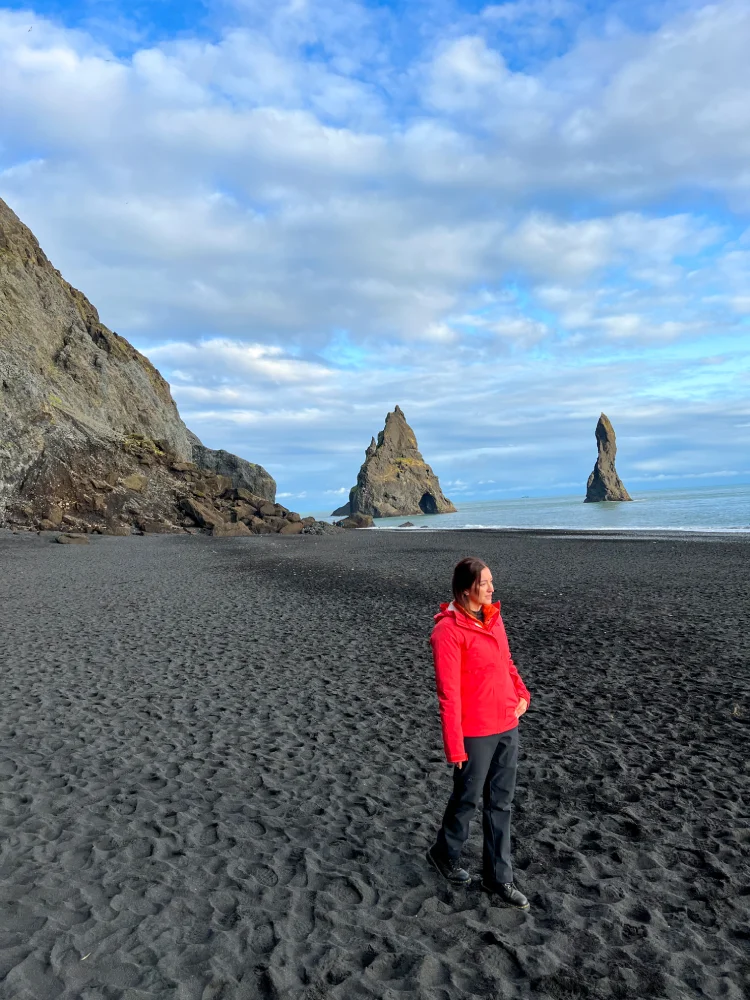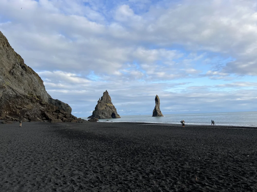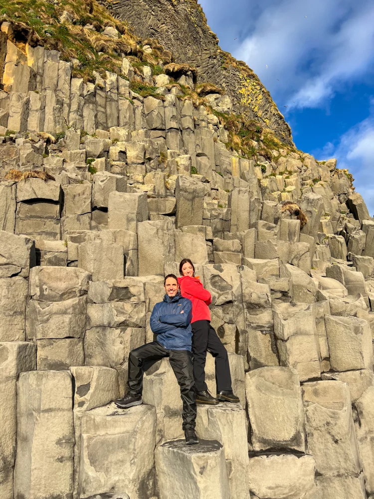 Seguindo pela costa, chegamos ao penhasco de Dyrhólaey, de onde se avista a praia de Reynisfjara, uma das mais impressionantes da Islândia. A combinação da areia negra vulcânica, das colunas de basalto e do oceano Atlântico batendo forte na costa cria um visual cinematográfico.