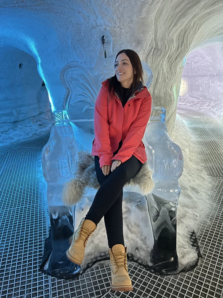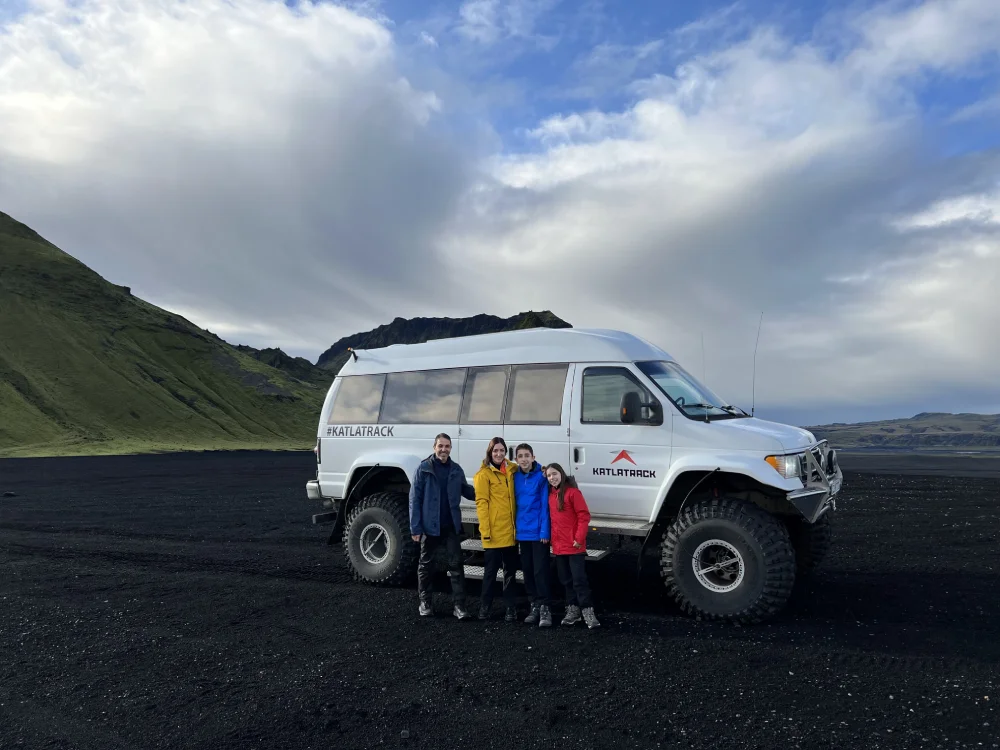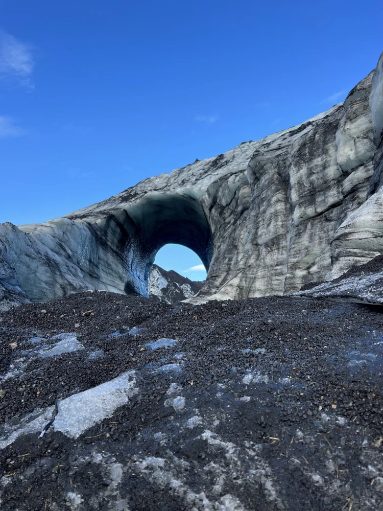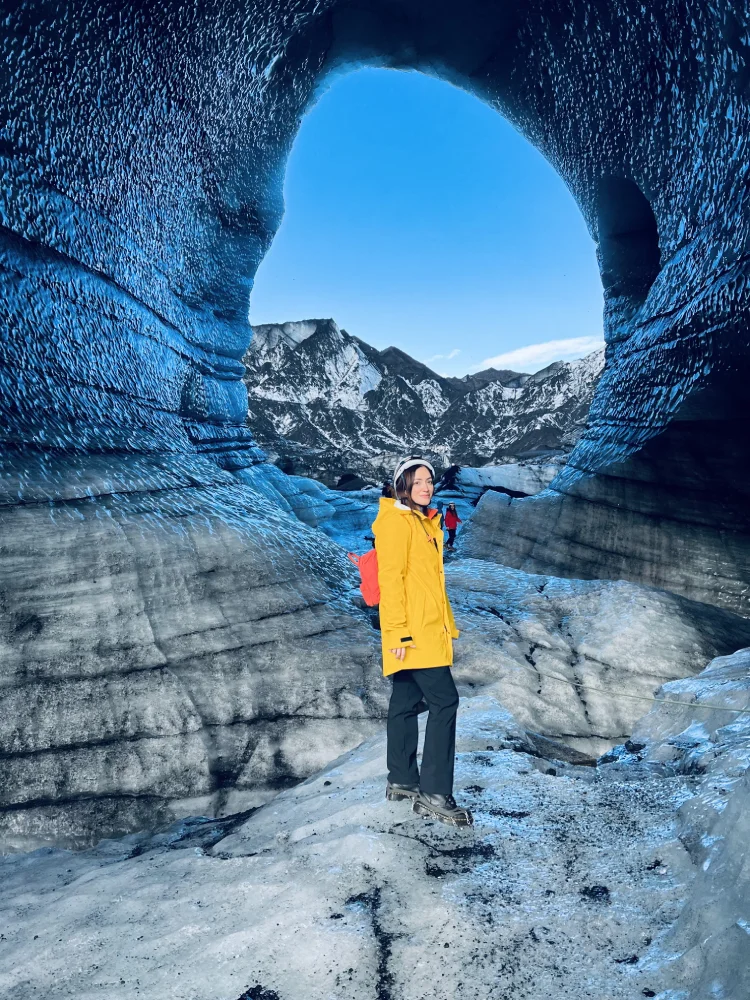 Foi também nessa região que vivenciamos uma das experiências mais incríveis da viagem: a visita à Katla Ice Cave, uma caverna de gelo formada sob a geleira Katla, próxima à vila de Vík. O passeio é feito com veículos 4×4 e guiado por profissionais locais, e o visual lá dentro é hipnótico — camadas translúcidas de gelo vulcânico que refletem a luz em tons de azul, branco e cinza.