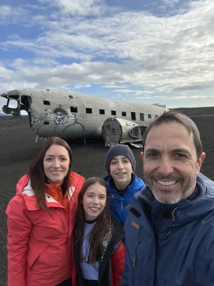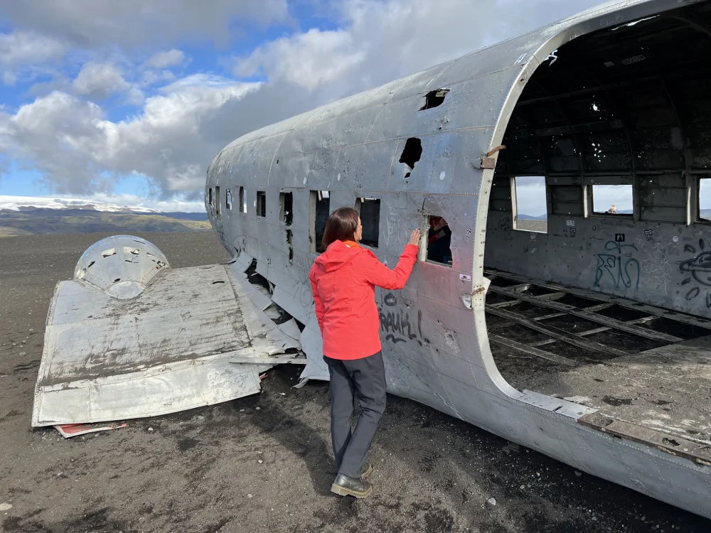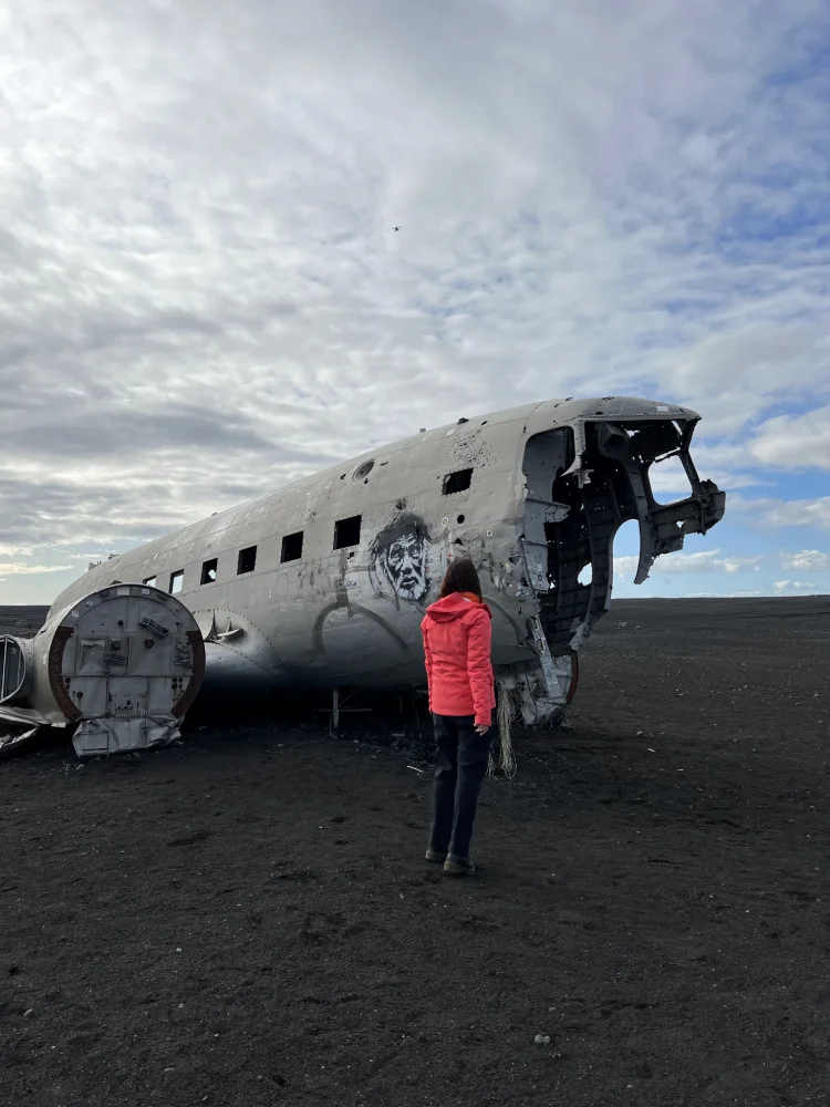 Em outro dia, caminhamos até o Sólheimasandur Plane Wreck, os destroços de um avião militar americano que caiu em 1973 e permanece até hoje sobre a areia vulcânica.A trilha de 4 km em cada trecho é longa e reta, parece não ter fim, mas o esforço é recompensado pela imagem do avião prateado isolado no meio do nada — um cenário fascinante.