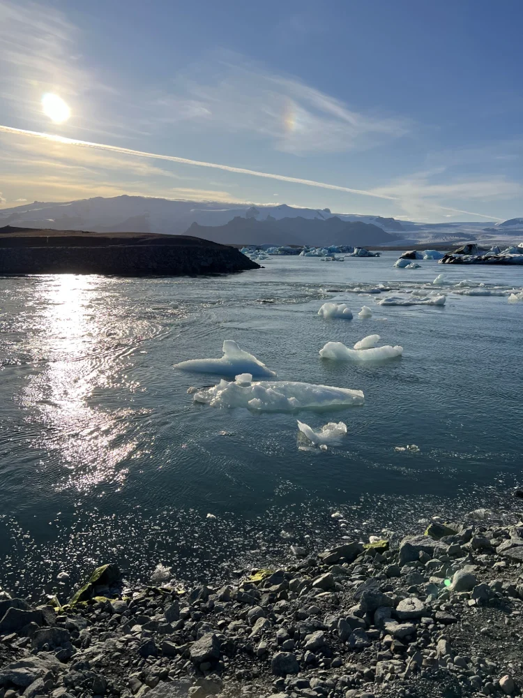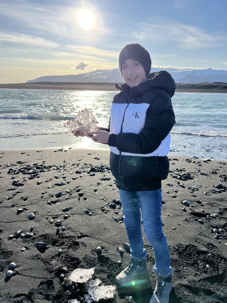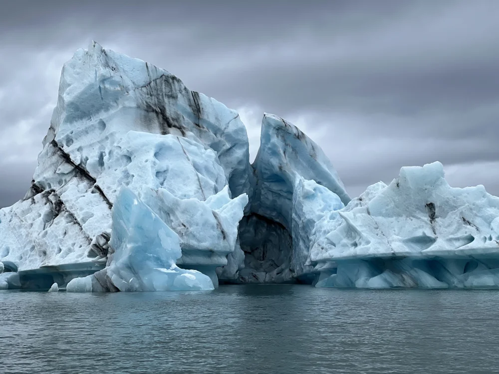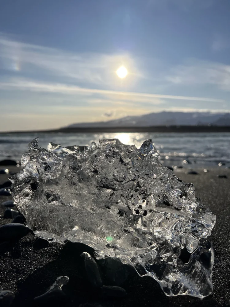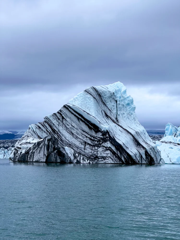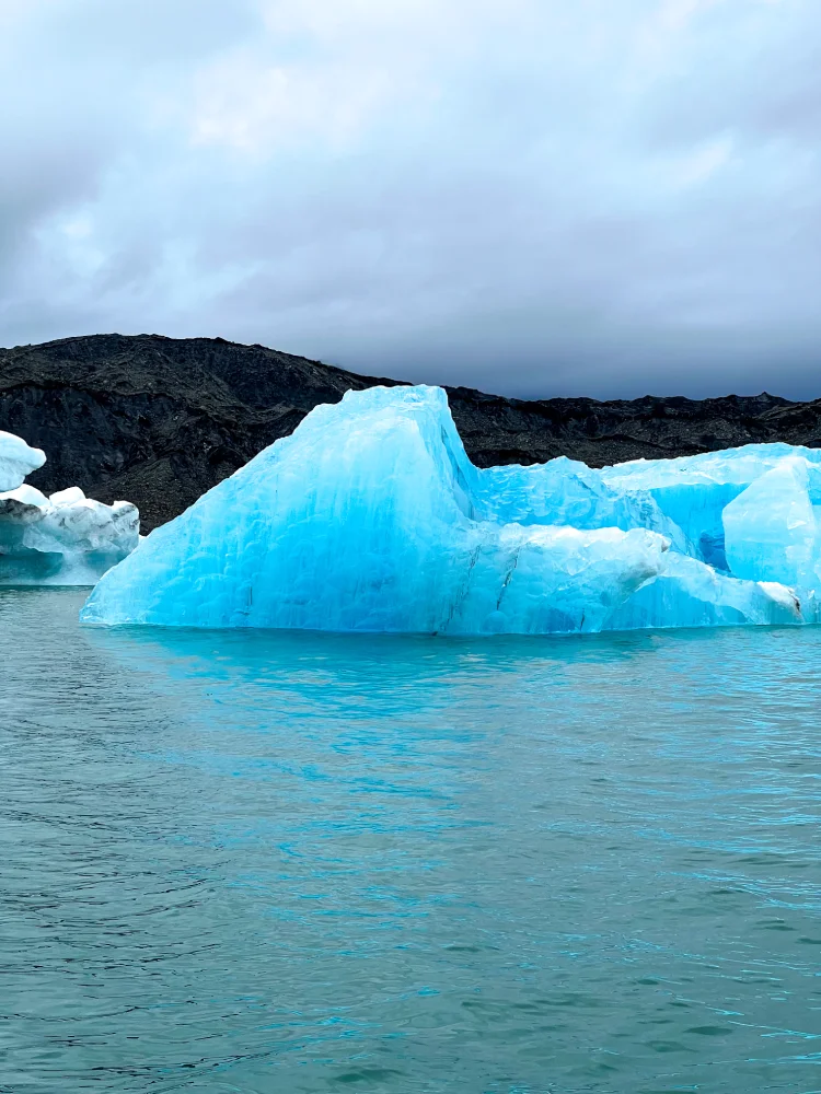 No dia seguinte, fizemos um passeio de barco tipo Zodiac pela Jökulsárlón Glacier Lagoon, navegando entre icebergs flutuantes que se desprendem da geleira Breiðamerkurjökull. O contraste entre o azul do gelo, o silêncio absoluto e o frio cortante criou uma das cenas mais poéticas que já vivemos.
