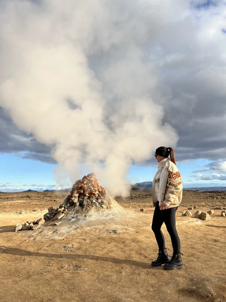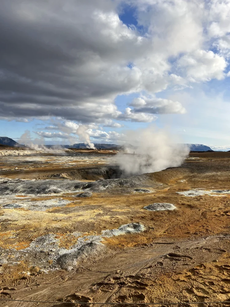 Ali perto, visitamos a área geotérmica de Hverir, onde o solo literalmente ferve. É um lugar quase extraterrestre, com poças de lama borbulhante, fumarolas e nuvens densas de vapor que sobem do chão. O cheiro é forte, mas é fascinante: ver a terra viva, pulsando sob nossos pés, é uma lembrança marcante.