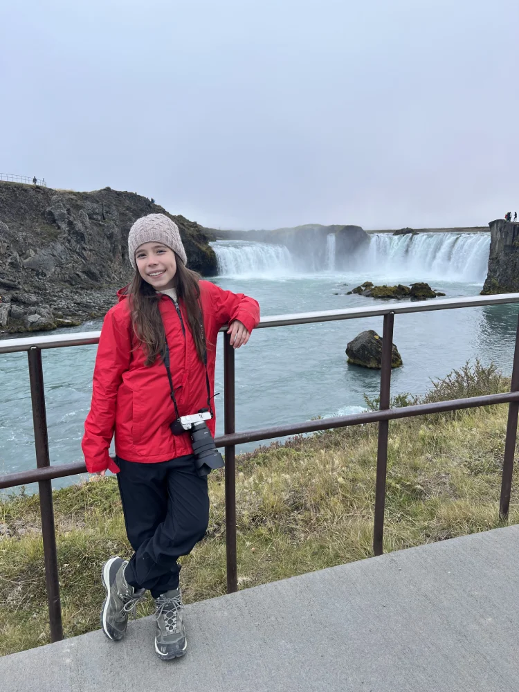 Já no fim da tarde, fizemos uma parada em Goðafoss, a chamada “Cachoeira dos Deuses”, uma das mais majestosas da Islândia. Suas quedas semicirculares formam um arco perfeito, e o som da água ecoando entre as rochas cria uma atmosfera poderosa e serena ao mesmo tempo.