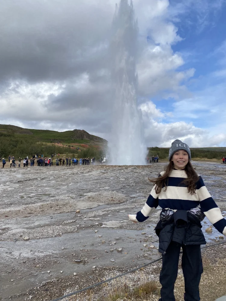 Seguimos para a Geysir Geothermal Area, onde o solo ferve e o ar é cortado por vapor quente. O destaque é o gêiser Strokkur, que entra em erupção a cada poucos minutos, lançando jatos d’água fervente a mais de 30 metros de altura — um verdadeiro espetáculo da natureza.