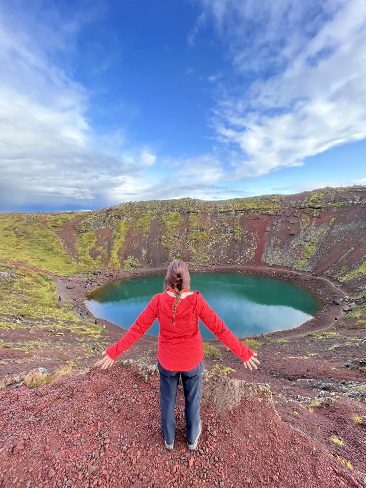 Encerramos o circuito na Kerid Crater, uma cratera vulcânica inativa com um lago azul-esverdeado em seu interior. O contraste entre as paredes avermelhadas e a cor da água é impressionante, e é possível caminhar por toda a borda da cratera — que foi o que fizemos, a sensação é indescritível.