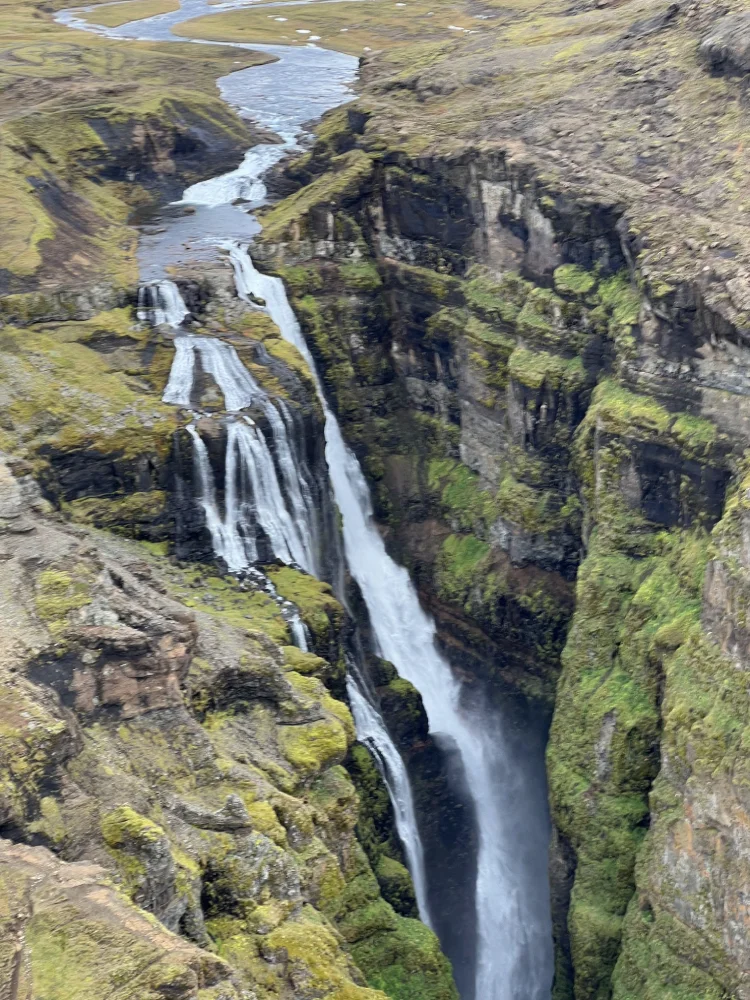 Nossa primeira parada foi no Stuðlagil Canyon, o cânion é formado por colunas de basalto perfeitamente simétricas, banhadas por um rio de águas azul-turquesa que corta o vale. Dizem que no verão a cor da água fica ainda mais cristalina, deixando o cenário impossível de descrever.